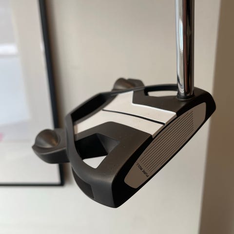 TaylorMade Spider Tour X Putter i sort og hvid farve med SuperStroke greb. Putteren har et unikt design med justerbare vægte og leveres med et matchende hovedcover. Egnet til golfspillere, der ønsker præcisionskontrol på greens.