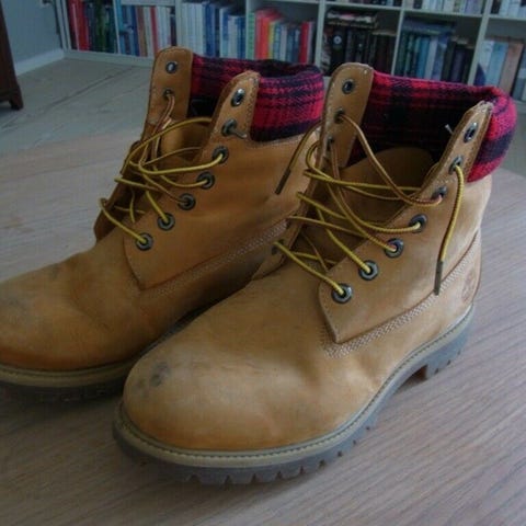 Timberland i råt læderlook. Det er ikke den gule som er blevet slidt. 😊