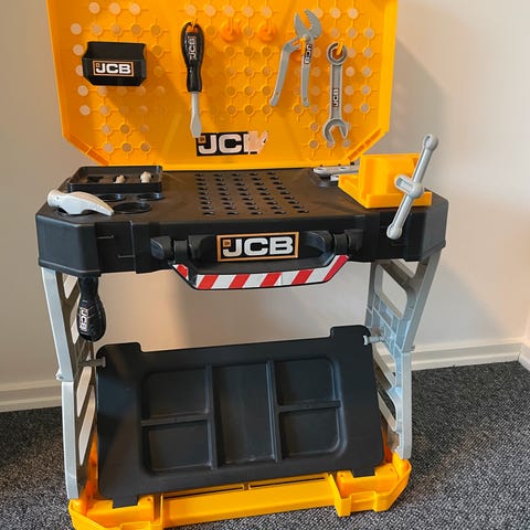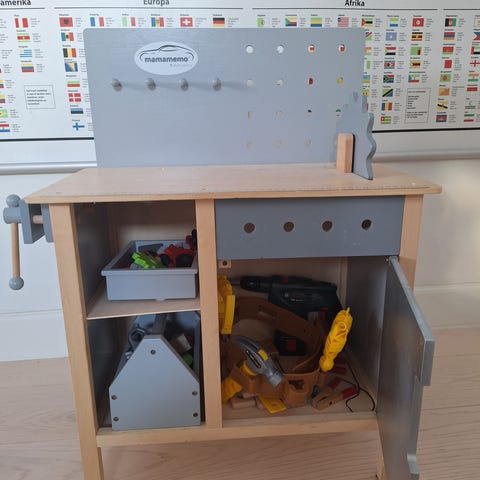 Værktøjsbord med tilhørende værktøj. Noget af værktøjet er på batterier og virker. Skruemaskinen er der tape på for at holde på “batteriet”. Der er stadig mange timers god leg i dette bord, vi har desværre ikke længere plads til det ☺️