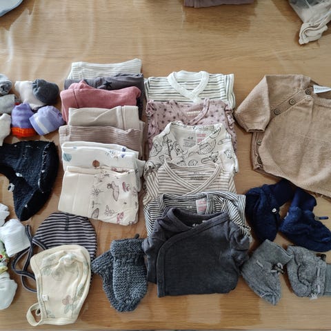 8 gratis dele følger med ( 3 strik strømper, 3 strik sutsko, 1 tynd strømpebuks, 1 jakke med pletter, ikke forsøgt vasket)