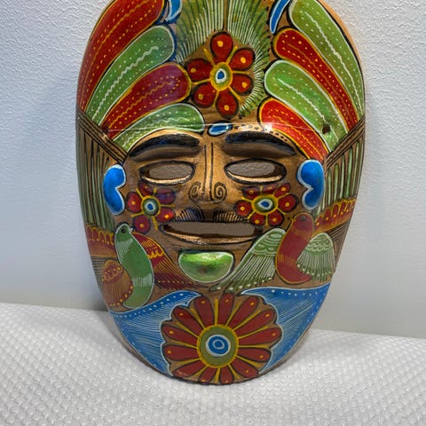 Venetiansk harlekin dekorationsmaske med detaljer i guld, blå og lyserøde farver. Dekoreret med små klokker og perleudsmykning, velegnet til ophæng. Måler ca 13 cm.