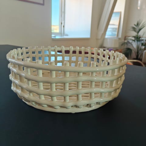 Ferm Living keramisk dekorationskurv med åben, flettet struktur i beige farve.