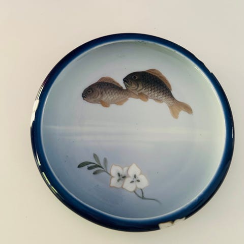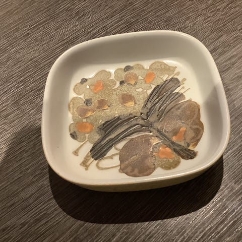 Fad i keramik med dekorativt mønster i blå og brune nuancer. Fadet er firkantet med afrundede hjørner og har et unikt design. Det er velegnet til servering eller som dekorativt element i hjemmet.