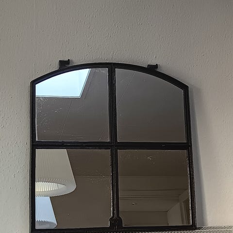 Staldvindue med smedejerns ramme og spejl. Kan åbnes.