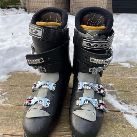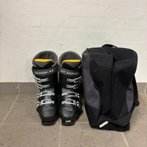 Salomon skistøvler i størrelse 26,5(41-42). Farven er sort og grå. Støvlerne er designet til alpinski og har flere spænder for justerbar pasform. Inderskoen er polstret for komfort og varme.