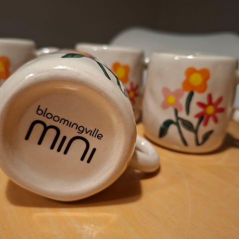 6 stk sødeste Bloomingville Millie minikruser i glaseret stentøj med håndmalede blomster mønstre . Aldrig brugte.