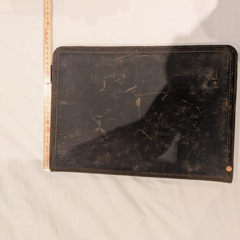 Saddleback leather, large portfolio, fave dark coffee brown, har en table sleeve. Har plads til en A4 blok