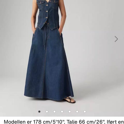 Levi’s retro denim nederdel i mellemblå med knapper. Waist str. 28, længde ca. 75 cm (til under knæene). A-shaped / A-formet. 1970’er look. Som ny, flot stand.