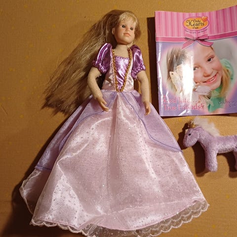 Lille dukke i ryttertøj med hest. Dukken er 10 cm, ansigt, hænder og fødder er i plast; resten af kroppen i er i stof, arme og ben er bøjelige. Ansigtet er individuelt, og øjnene er ikke påmalet, men er sat ind. Håret kan friseres, flettes m.m.