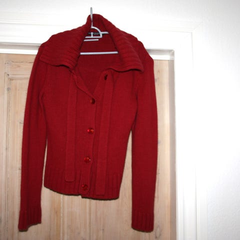 Philosophy Blues Cardigan, størrelse XL til kvinder. Strikket materiale med knaplukning foran og dekorative detaljer ved ærmekanter og bund. Velegnet som yderlag eller til lag-på-lag brug.