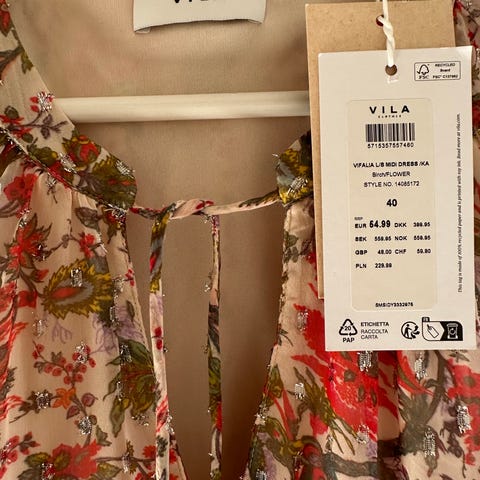 Vila Hverdagskjole i størrelse M med multifarvet mønster. Kjolen har lange ærmer og elastikdetaljer ved taljen og ærmerne. Materialet er let og egnet til dagligt brug.