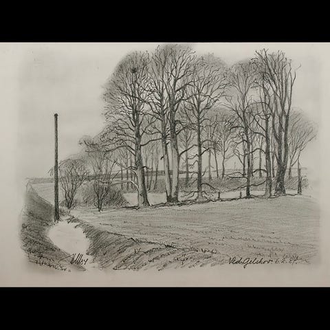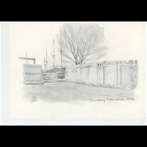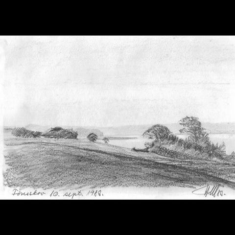 Tegning af Kildevæld, Krarup 06-03-1982 malet af Hans Mandøe