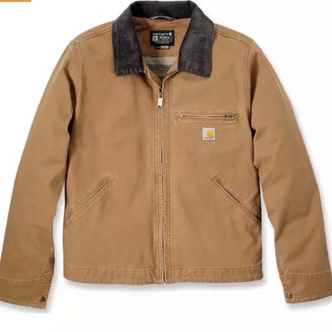 Carhartt Detroit Jakke i farven brun og størrelse S. Jakken er fremstillet af slidstærkt materiale med detaljer som en lynlås foran, knaplukning ved ærmerne og justerbare stropper i taljen. Designet til mænd og egnet til udendørs brug.