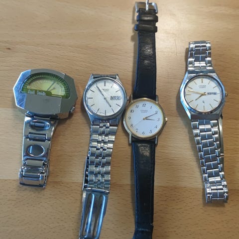 10 forskellige ure, alle urene virker som de skal. Alle urene skal have nyt batteri og 2 af dem ny rem. Sælges samlet inklusiv urboks.