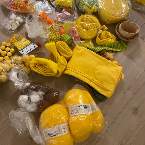hoveder, Hatte, Sko, Stokke, stof, forskellige str øjne, træ kugler, vat ruller, forskellige farver roser, tubestrik og meget mere