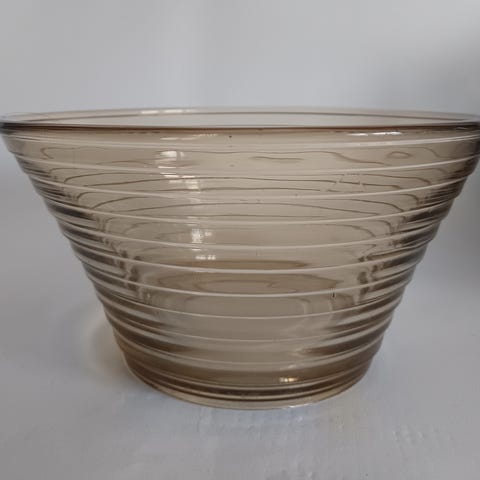 Gammel skål i rillet gennemfarvet ravgult / ravfarvet glas, fra pressemønstret Broksø, designet af selveste Jacob E. Bang, i 1938 for Holmegaard Glasværk.