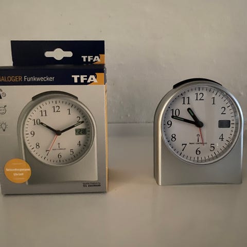 Uret har et analogt display med tydelige sorte tal og markeringer på hvid baggrund. Uret er udstyret med snooze-funktion og en sort knap på toppen samt en tænd/sluk-knap. Strømforsyning sker via ledning til stikkontakt. Uret har en kompakt og bærbar størrelse, egnet til brug på natbord eller skrivebord.