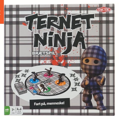 Tactic Ternet Ninja Brætspil med terninger og spillebrikker. Spillet indeholder et ternet spillebræt og figurer, der forestiller ninjaer. Egnet til børn fra 7 år og op til flere spillere. Materialer inkluderer pap og plastik.