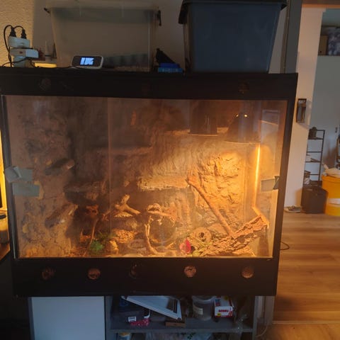 Terrariet er specialbygget. Det er 100 cm langt, 50 cm bredt og 60 cm højt, hvor de øverste 10 cm bruges som skjult rum til kabler og lampefatninger. Det er lavet af hvid møbelplade (18 mm) med gråt, struktureret baggrund på tre af siderne samt i bunden – alt sammen fugtsikret. Der er indbygget vandbassin i bunden. Totalvægten er omkring 50 kg.