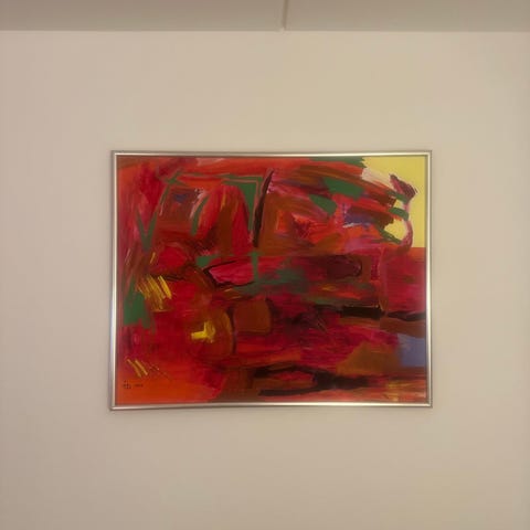 Maleriet har en farverig og ekspressiv stil med nuancer af rød, gul, grøn og blå. Indrammet i en guldfarvet ramme. Velegnet til vægophæng som dekorativ kunst.