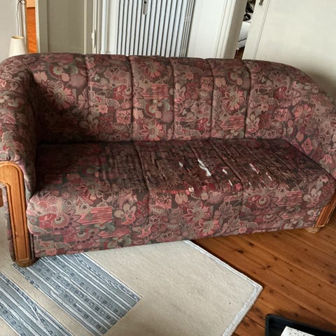 Flot herskabssofa fra år 1900, med flotte mønstre og udskæringer på armlæn og ryglænet. Betrækket har et par pletter, men ser ellers fint ud. Købt brugt i 2015 for 1.000 kr.