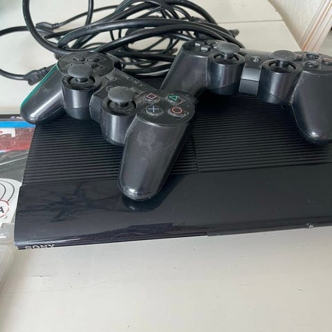 PS3 inkl. 2 controllere samt ledning til ladning af controllere og strømforsyning.