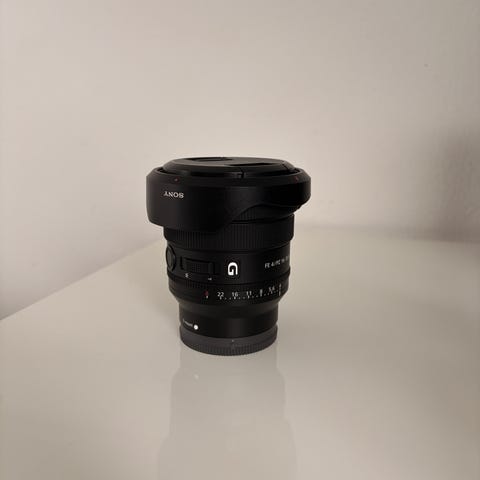 Sony FE PZ 16-35mm F4 G objektiv med zoomfunktion og blænde F4. Objektivet er designet til spejlløse kameraer med full-frame sensor og har en brændvidde på 16-35mm. Inkluderer modlysblænde og stofpose til opbevaring.