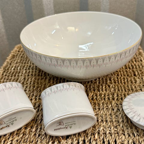 Eschenbach Porcelæn Spise/Kaffe stel bestående af 82 dele. Sættet inkluderer tallerkener, kopper, underkopper, serveringsfade og sukkerskål med låg. Materialet er porcelæn med hvid base og dekorative guldkant. Designet er klassisk og velegnet til formelle spisesituationer.