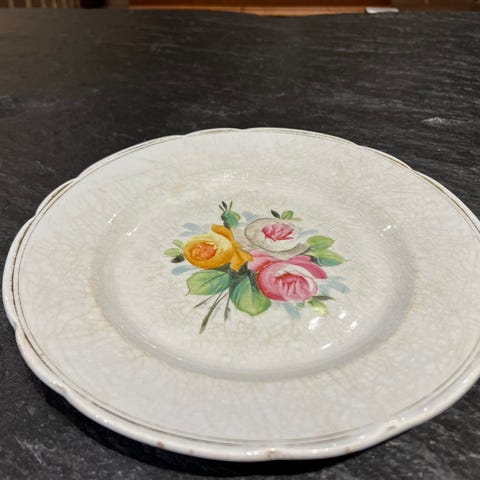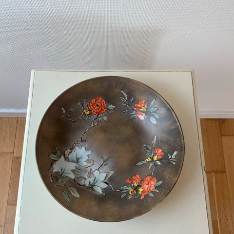 Johann Haviland dekorativ tallerken i blomsterdesign-håndmalet med blomster på en næsten Bourgogne/rød baggrund og gulddekoration omkring tallerkenen. Måler 27 cm" i diameter. Lavet i Tyskland og er stemplet i bunden. E 10933 nr. 28
