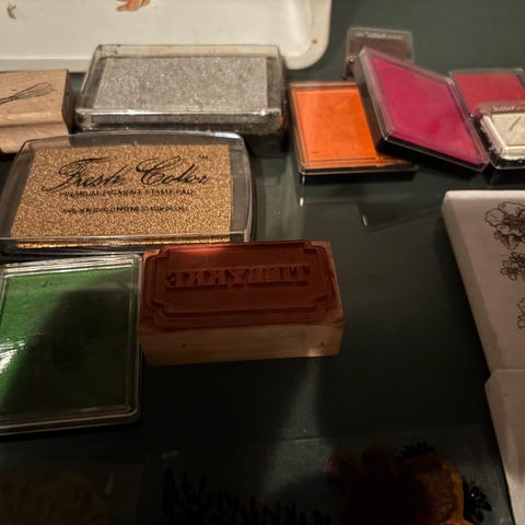 Sæt bestående af tre træstempler med håndtag i farverne rød og beige. Inkluderer to blækpuder i farverne rød og sort. Stemplerne er monteret på et træstativ. Produktet kan anvendes til aftryk på papir eller andre materialer.