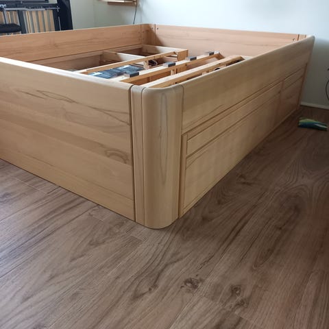 Fine Kaagaard elevationsseng i solidtræ.170×200cm. Virker som det skal. To brugte madrasser 85×200 følger med hvis i vil have dem. (Pletterne på billedet er kameraets skyld)) byd gerne. I skal selv dissasemble og tage det ned fra 2 sal.