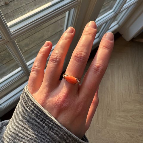 En vintage fulde ring,med en ægte koral perler på toppen. Den er 18 karat guld, den er 58 i størrelse.