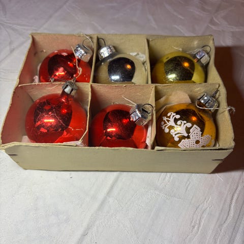12 retro julekugler med fine motiver og blå/sølv nuancer. Fra '80/'90erne. Lavet af plast, ø 6 cm.