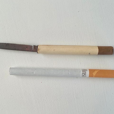 Kniven kan låses, knivens samlet længde er 14 cm. knivbladets længde er 5-6 cm.