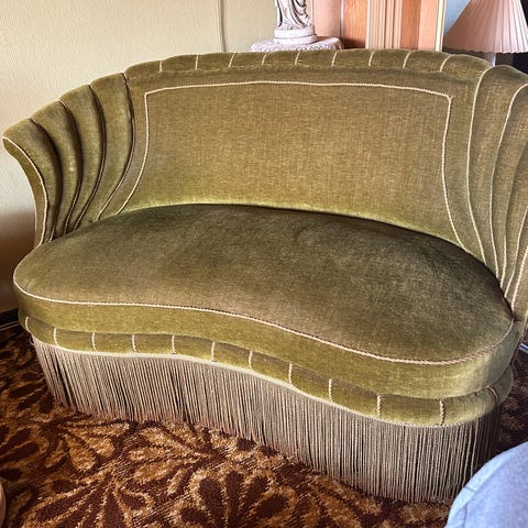 Smuk gammel diva, som er ombetrukket i grå velour.