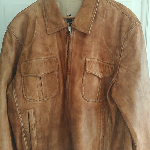 Vintage læderjakke i str. mellem M og L. Grå-brun. God stand