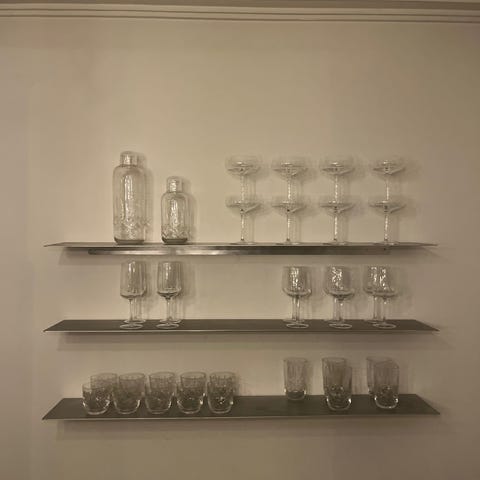 Louise Roe - mundblæste krystal champagne glas. Fin stand - det ene har dog en revne, som vist på billedet. 4 stk. Nypris for alle 4: 2.400,-. Kan afhentes i Risskov eller Aarhus