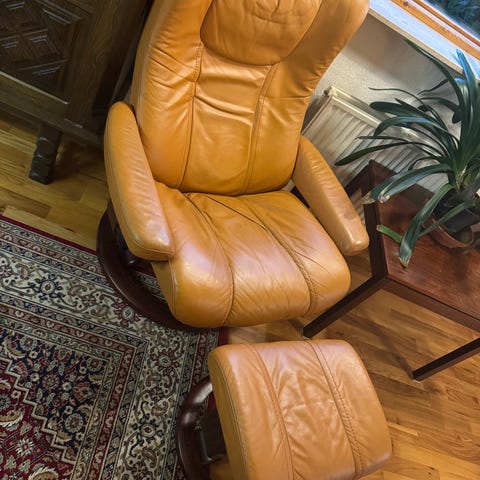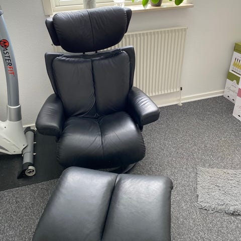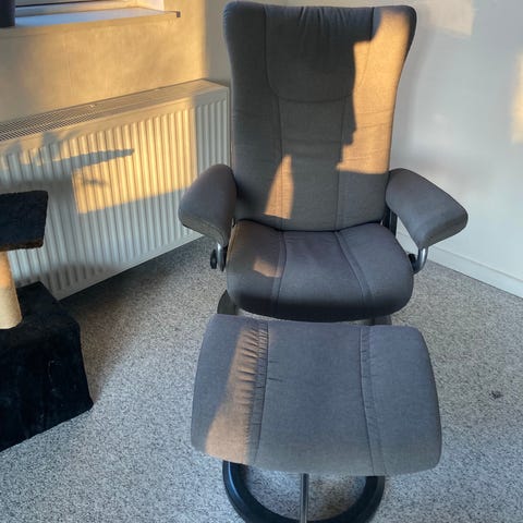 Grågrøn lænestol, Stressless, kan justeres til mere liggende stilling. Meget velholdt og fungerer fint. Står i Kokkedal