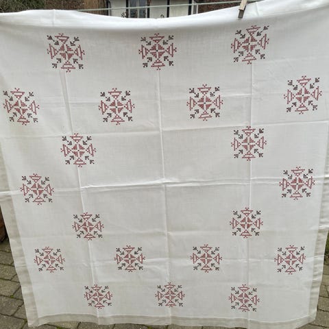 Hvid dug med brunt broderi.