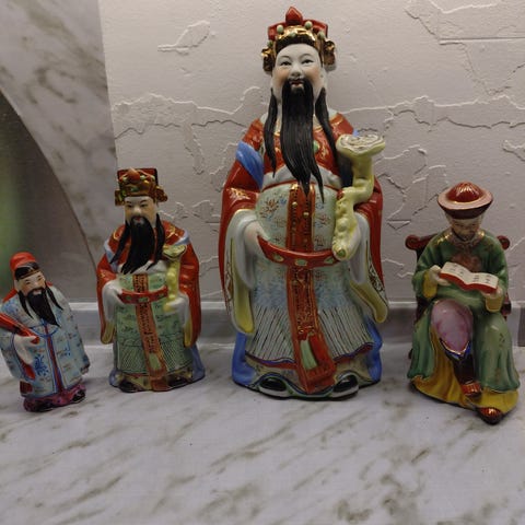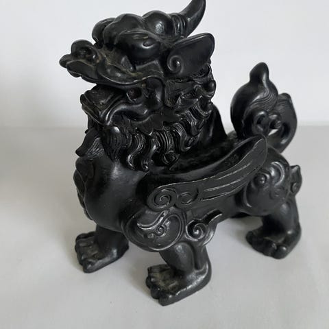 Hver figur står på en firkantet base og er designet med karakteristiske træk som åbent gab og dekorative elementer på kroppen. Velegnet til dekorative formål.
