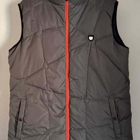 Lee vest i størrelse L, blå farve. Vesten har hætte og er foret med ternet mønster indvendigt. Materialet er polstret for ekstra varme. Velegnet til udendørs brug.
