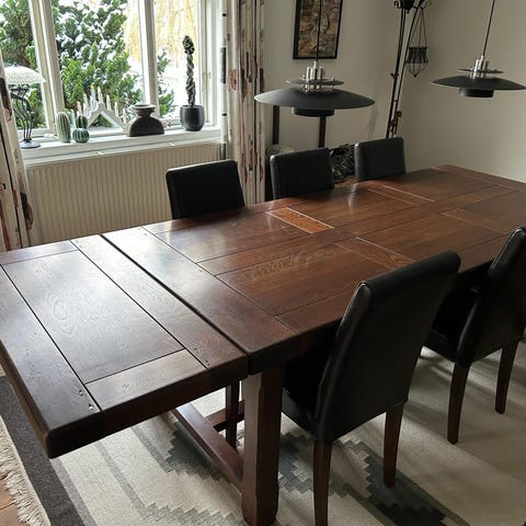 Bordet har plader gemt under bordpladen i begge ender og kan forlænges til 14 pladser.