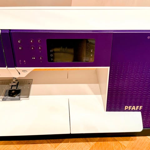 Pfaff Expression symaskine med digitalt display og flere kontrolknapper til indstilling af sømme og funktioner. Maskinen er designet til alsidig syning med forskellige sømvalg og brugervenlige betjeningsmuligheder.