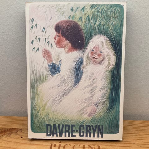 Billede med tekst med en pige og dreng, måler 14 x 14 cm, 30 kr
