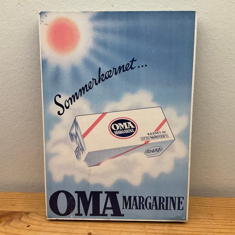 Oma margarine, måler 15 x 21 cm, har en lille fugtskade i et hjørne, 25 kr