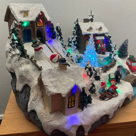 Sød lille juleby. Med kirker, 2 huse, 1 gård, 3 træer og 4 nisser.