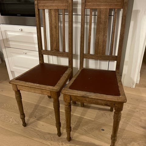 Stolene er fremstillet i massivt egetræ, sæderne er i læder med prægede blomster motiver. Hver stol er unik med hvert sit blomstermotiv: Påskelilje, Stedmoder, Lilje, Pinselilje, Tulipan og Åkande. Stolene er fremstillet i 1901, og de er restaureret omkring 2000 med nye sædebunde og kantbånd i skind. Alle 6 stole sælges for 500kr. Enkelt stole sælges for 100 kr. per stk.