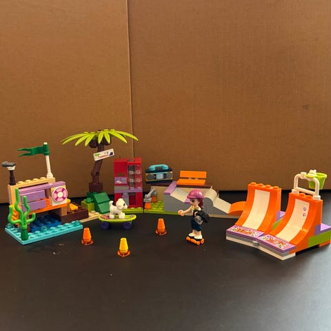 LEGO Friends 41009 Skatepark byggeklodser sæt med forskellige klodser og en vejledning. Indeholder dele til at bygge en skatepark med ramper og tilbehør. Egnet til børn og samlere.