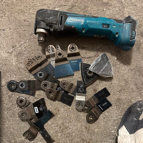 Makita 341CT Multicutter elværktøj med elektrisk ledning. Værktøjet er designet til præcisionsskæring og slibning i forskellige materialer. Den har et kompakt design med et håndtag for bedre kontrol under brug.