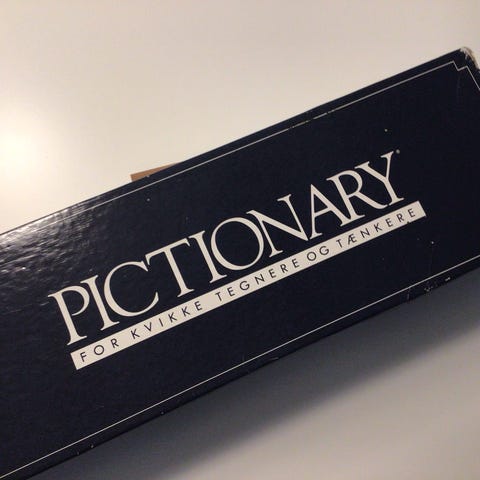 Pictionary brætspil med spilleplade, kort, terninger, timeglas, blyanter og kategorikort. Spillet indeholder alle nødvendige komponenter til at spille, herunder regler og tilbehør.
